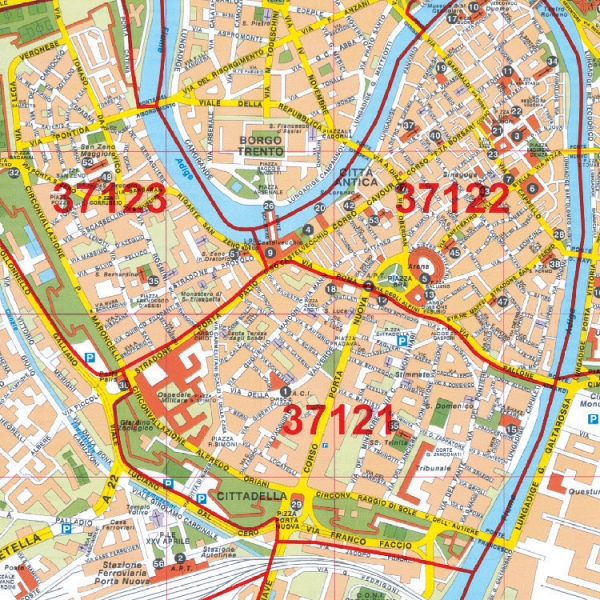 Plan of the city of Verona with the boundaries of postal codes and their corresponding numbers.
