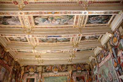 Fu così che nel 1587 fu affidato al bolognese Baldassarre Croce, l'incarico di eseguire sulle pareti, alcuni affreschi, lasciando a Tarquinio Ligustri il compito di dipingere il restante soffitto a cassettoni in sedici riquadri, raffiguranti i trentatré castelli che si trovavano sotto l’influenza della città di Viterbo.