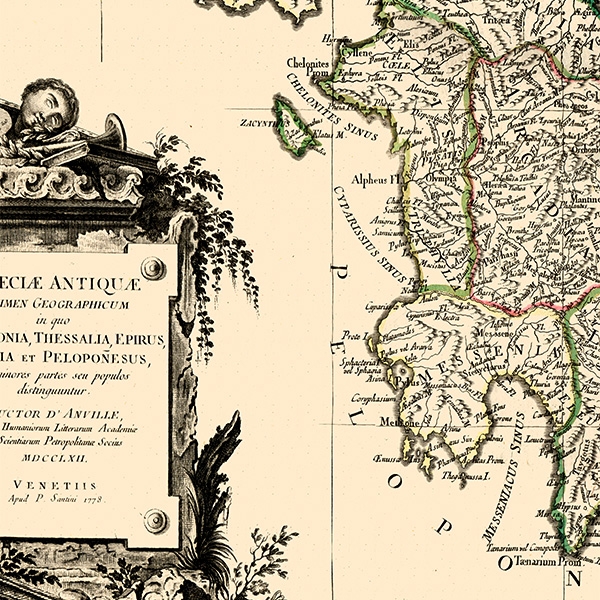Riproduzione a colori di una antica carta geografica della Grecia Antica da un originale del 1778.