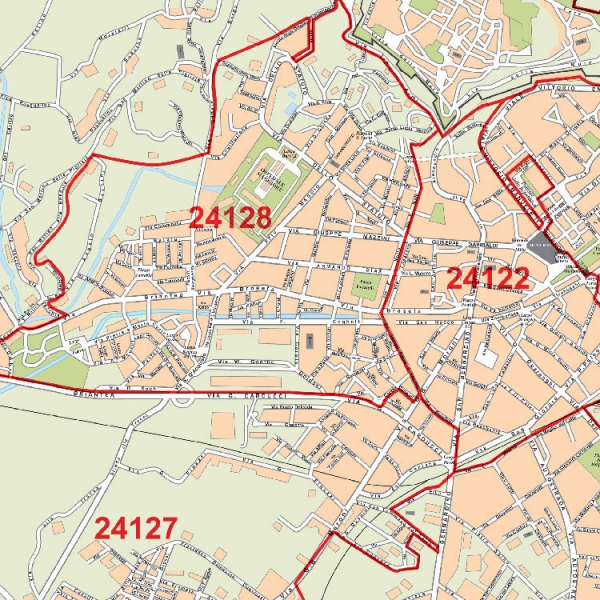 Planimetria della città di Bergamo coni limiti dei CAP e i relativi numeri.